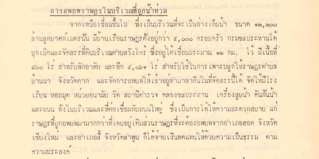 ภาพเอกสารและสภาพพื้นที่จัดสรรแห่งใหม่เพื่อรองรับการอพยพของชาวบ้าน ที่ระลึกในการเสด็จพระราชดำเนินไปทรงประกอบพิธีเปิดเขื่อนภูมิพล 17 พฤษภาคม 2507