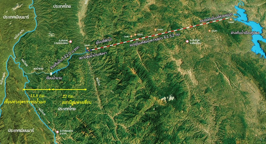 ภาพองค์ประกอบของโครงการผันน้ำยวมครอบคลุมพื้นที่ 3,641.8 ไร่ ประกอบด้วยเขื่อนกั้นแม่น้ำยวมสูง 69 เมตร อ่างเก็บน้ำขนาด 2,075 ไร่ สถานีสูบน้ำ และอุโมงค์คอนกรีตยาว 61 กิโลเมตร ผ่านพื้นที่อุทยานแห่งชาติ 1 แห่ง และป่าสงวน 6 แห่ง เพื่อผันน้ำจากอ่างเก็บน้ำยวมตอนล่างไปยังเขื่อนภูมิพล