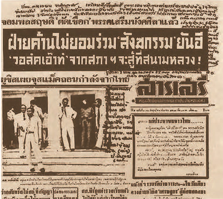 ภาพ (ซ้าย) หนังสือพิมพ์พาดหัวข่าวการวอล์คเอ๊าต์ของฝ่ายค้านเพื่อต่อต้านการสร้างเขื่อนเขื่อนยันฮี ซึ่งเป็นหนึ่งในประเด็นการเมืองที่พรรคฝ่ายค้านใช้ต่อสู้กับพรรคเสรีมนังคศิลาของจอมพล ป. ที่กำลังครองอำนาจขณะนั้น (ขวา) เมื่อวันที่ 12 กันยายน 2500 (ก่อนที่รัฐบาลจอมพล ป. จะถูกจอมพล สฤษดิ์ ทำการรัฐประหาร 4 วัน) รัฐบาลไทยและธนาคารได้ลงนามในสัญญากู้เงินจากธนาคารโลกจำนวน 66 ล้านเหรียญสหรัฐ เพื่อนำมาสร้างเขื่อนยันฮี นับเป็นมูลค่าเงินกู้สูงสุดที่ธนาคารโลกเคยอนุมัติ