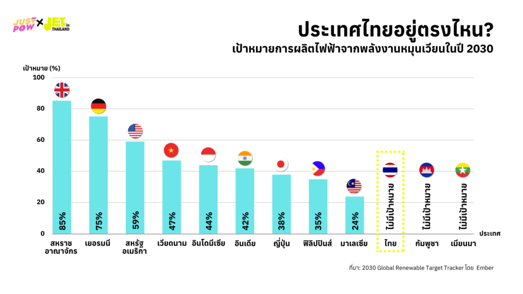 เมื่อเปรียบเทียบข้อมูลของไทยจากรายงาน ‘2030 Global Renewable Target Tracker’ กับประเทศอื่นๆ พบว่า ไทยเป็น 1 ใน 17 ประเทศที่ไม่มีการกำหนดเป้าหมายสัดส่วนการผลิตไฟฟ้าจากพลังงานหมุนเวียนในปี 2030 รวมถึงประเทศเพื่อนบ้านอย่างกัมพูชา และเมียนมาก็ไม่มีการกำหนดเป้าหมายเช่นเดียวกับไทย ในขณะที่สหรัฐอเมริกา สหราชอาณาจักร และเยอรมนี ได้กำหนดเป้าหมายสัดส่วนการผลิตไฟฟ้าจากพลังงานหมุนเวียนในปี 2030 มากกว่าร้อยละ 50 เนื่องจากประเทศเหล่านี้มีแผนที่จะบรรลุเป้าหมาย Net Zero อย่างช้าที่สุดภายในปี 2050