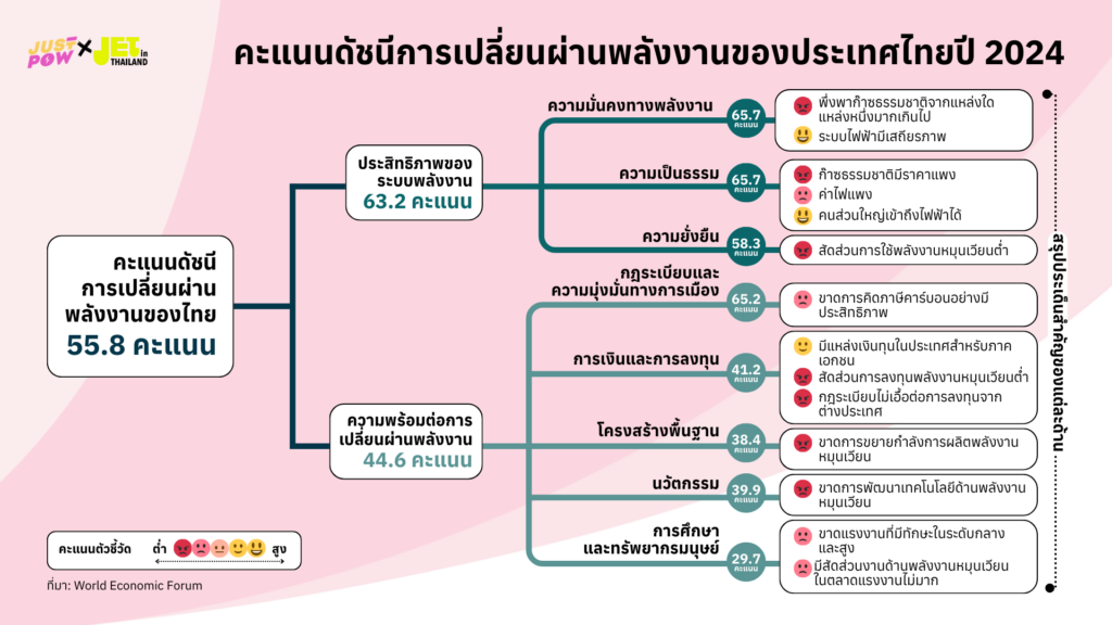 นอกจากการสำรวจคุณภาพของเป้าหมายการเปลี่ยนผ่านพลังงานของไทย เราลองมาสำรวจความพร้อมของไทยต่อการเปลี่ยนผ่านพลังงาน จากข้อมูลในรายงานดัชนีการเปลี่ยนผ่านพลังงาน (Energy Transition Index) ซึ่งจัดทำขึ้นทุกๆ ปี โดย World Economic Forum ในรายงานฉบับล่าสุดเผยแพร่เมื่อเดือนมิถุนายนที่ผ่านมา พบว่า ไทยมีคะแนนดัชนีการเปลี่ยนผ่านพลังงานรวม 55.8 คะแนน (จากคะแนนเต็ม 100 คะแนน) อยู่อันดับที่ 60 จาก 120 ประเทศ และมีอันดับลดลงจากปีที่แล้วซึ่งไทยอยู่ในอันดับที่ 54 ขณะที่หลายประเทศในกลุ่มอาเซียนมีอันดับสูงกว่าไทย ไม่ว่าจะเป็นเวียดนาม มาเลเซีย และอินโดนีเซีย มีคะแนนอยู่ในอันดับที่ 32 40 และ 54 ตามลำดับ