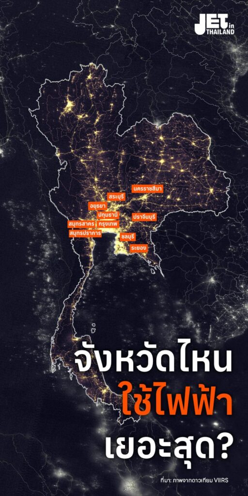 แต่กำลัง ‘สะท้อน’ ให้เห็นว่า ไม่ใช่แค่การใช้ไฟฟ้าที่กระจุกตัว แต่ยังโยงถึงกิจกรรมทางเศรษฐกิจที่มีการใช้ไฟฟ้าเป็นจำนวนมากก็กระจุกตัวอยู่ในจังหวัดเหล่านี้เช่นกัน