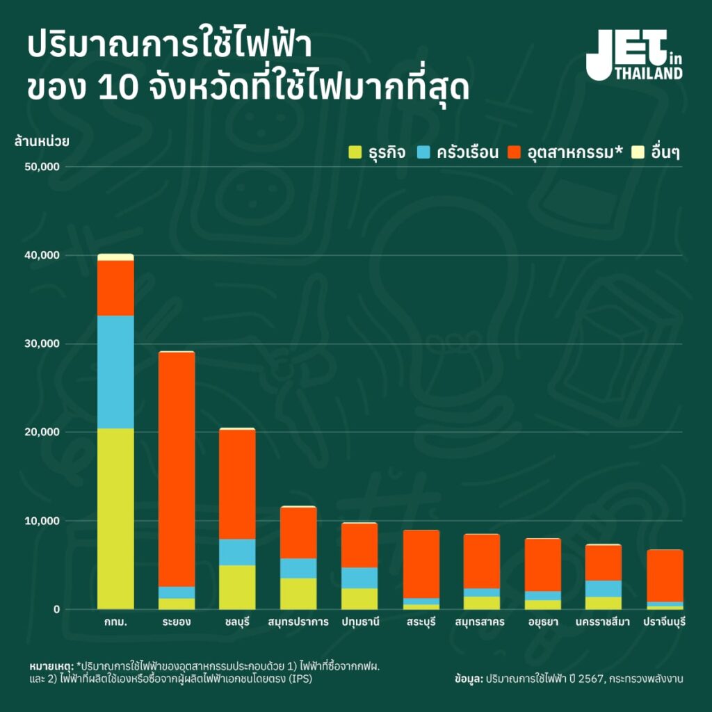 หากจำแนกปริมาณการใช้ไฟฟ้าของ 10 จังหวัดที่ใช้ไฟสูงสุดตามรายสาขา จะพบว่า ภาคอุตสาหกรรมคือสาขาที่ใช้ไฟฟ้ามากสุดเป็นอันดับ 1 ยกเว้นกรุงเทพมหานคร ที่การใช้ไฟในภาคธุรกิจครองแชมป์สูงสุดแซงหน้าอุตสาหกรรม