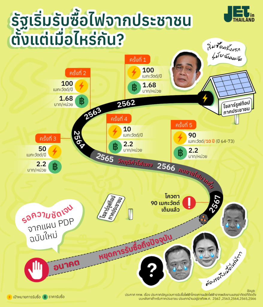 การรับซื้อไฟจากประชาชนเกิดขึ้นครั้งแรกในสมัยรัฐบาลพลเอกประยุทธ จันทร์โอชา ภายใต้โครงการ ‘โซลาร์รูฟท็อปภาคประชาชน’ มีการประกาศโควตารับซื้อไฟฟ้าจากโซลาร์บนหลังคา ประเภทบ้านอยู่อาศัย(กำลังการผลิตติดตั้งไม่เกิน 10 กิโลวัตต์) จำนวน 100 เมกะวัตต์ต่อปี ในราคา 1.68 บาท/หน่วย สัญญาซื้อขายไฟ 10 ปี